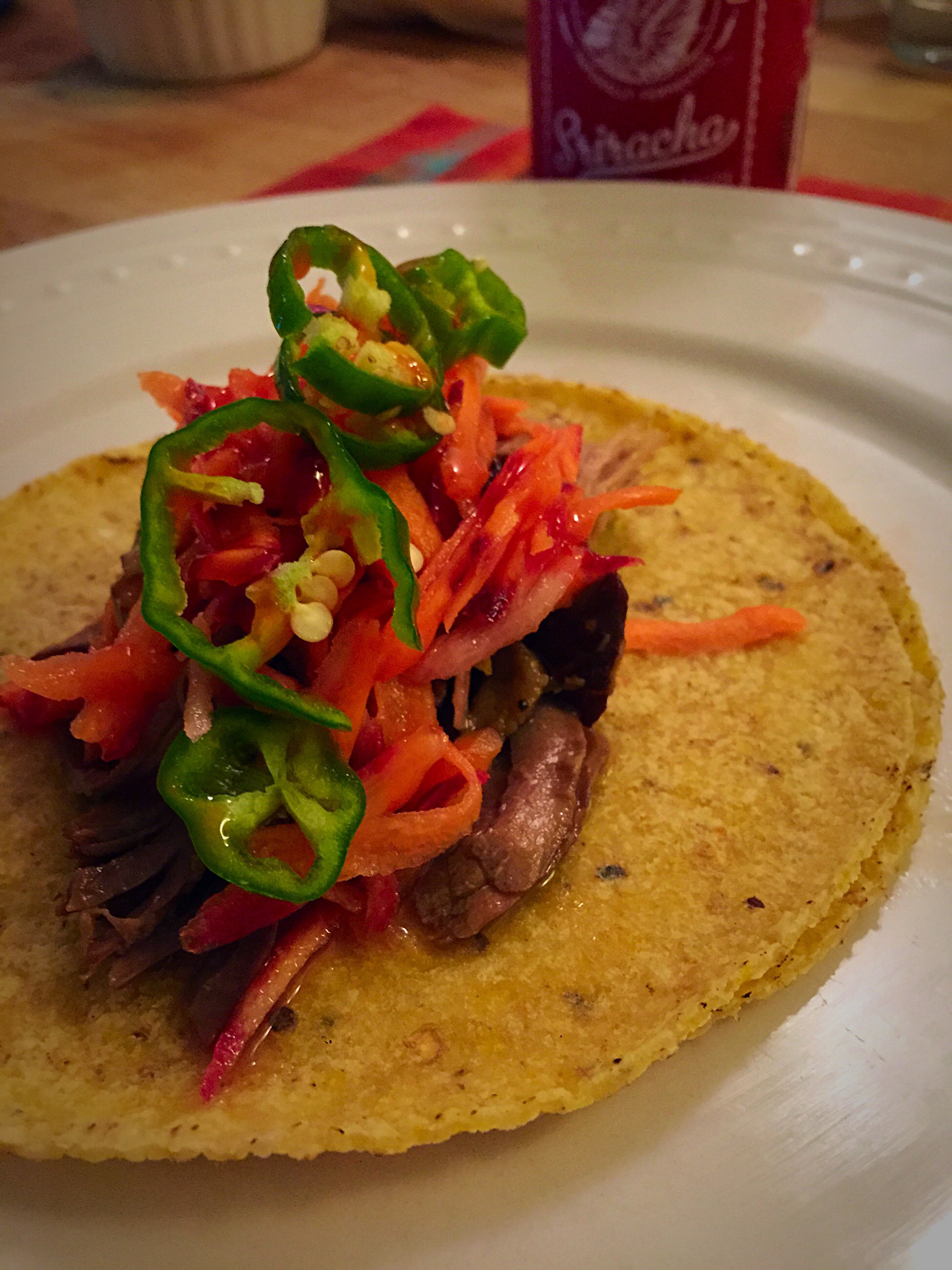 Adobo Pulled Pork Tacos with Rainbow Carrot & Shishito Pepper Slaw
